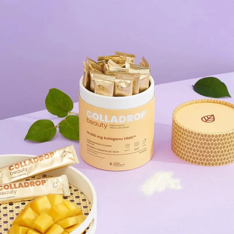 Colladrop® Beauty, an HMG™ collagen by Aura Herbals, is a mango-flavoured powdered dietary supplement containing hydrolysed marine collagen types I and III as well as coenzyme Q10, selenium and the brand's Quali®-C vitamin.