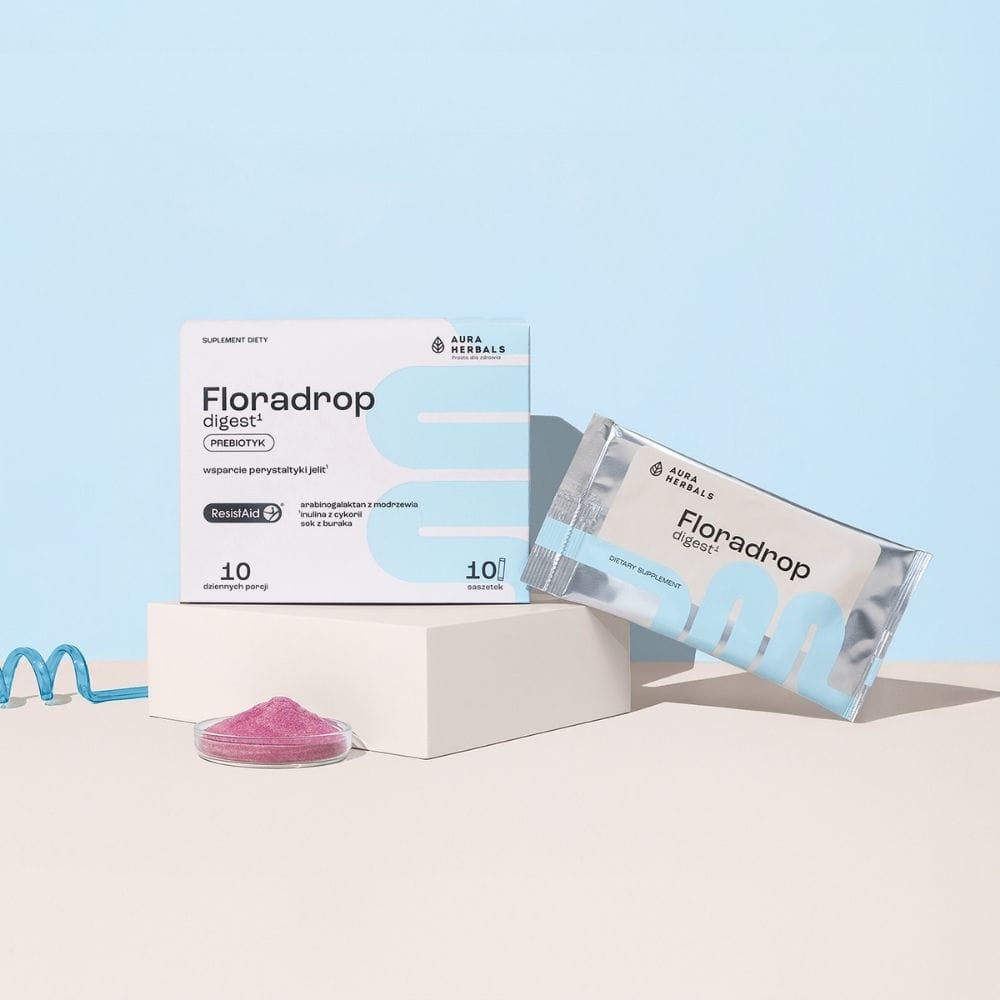 Aura Herbals Floradrop digest is a powdered dietary supplement in convenient sachets. A natural source of prebiotics. Contains branded American larch extract (Larix laricina) standardised to 85% arabinogalactan (ResistAid®). With added chicory inulin and beetroot juice.