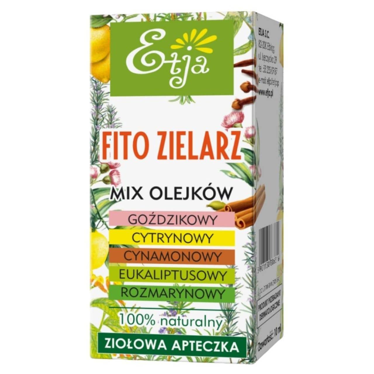 Fito Zielarz oil is a professional blend of 5 natural essential oils: lemon, cinnamon, eucalyptus, clove and rosemary. Warming and refreshing, with an intense spicy-citrus aroma. Supports immunity, helps with respiratory tract infections and rheumatic pains. 100% natural, certified formula!
