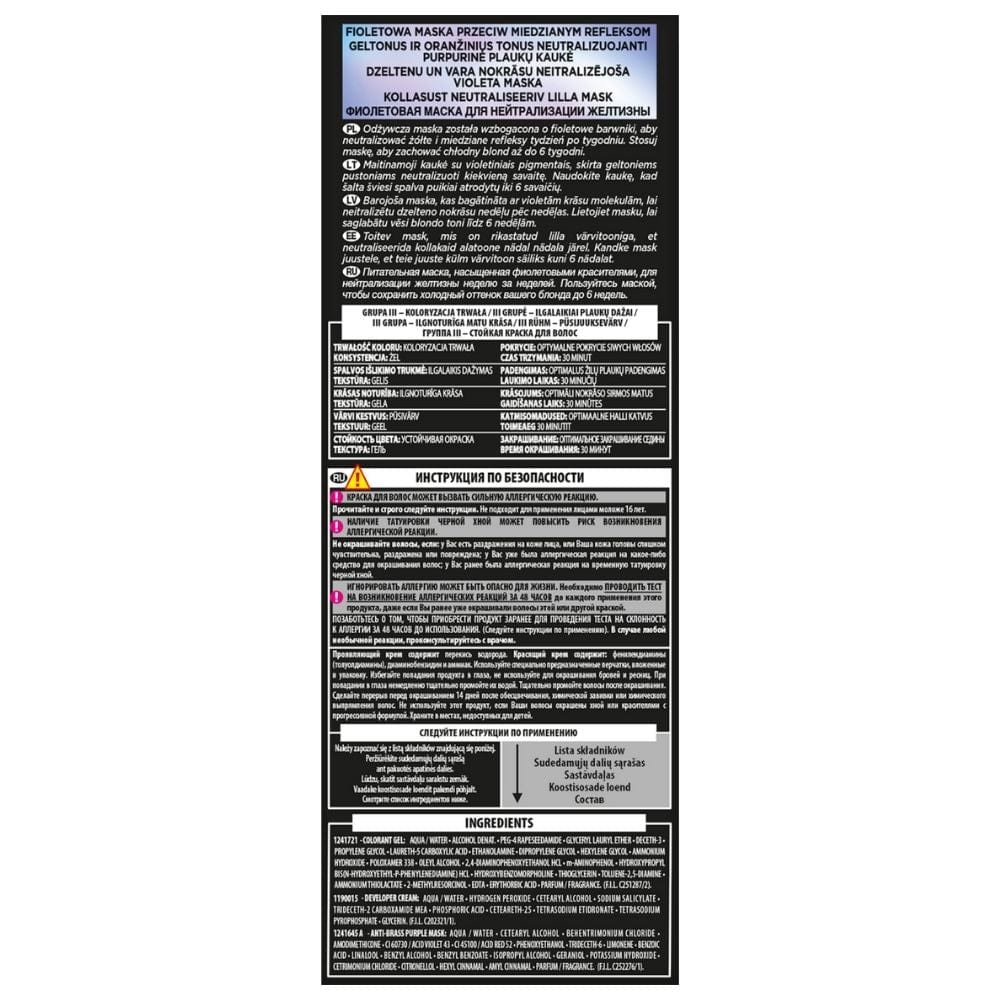 Colour gel: Aqua/Water, Trideceth-2 Carboxamide Mea, Propylene Glycol, Hexylene Glycol, PEG-2 Oleamine, Polyglyceryl-4 Oleyl Ether, Oleyl Alcohol, Alcohol Denat., Ammonium Hydroxide, Polyglyceryl-2 Oleyl Ether, Oleic Acid, Sodium Diethylaminopropyl Cocoaspartamide, 2,4-Diaminophenoxyethanol HCl, m-Aminophenol, 2-Amino-3-Hydroxypyridine, Sodium Metabisulfite, Hydroxypropyl Bis(N-Hydroxyethyl-P-Phenylenediamine) HCl, Eugenol, Ammonium Acetate, Linalool, p-Phenylenediamine, Alpha-Isomethyl Ionone, Resorcinol, EDTA, Citronellol, Erythorbic Acid, Parfum/Fragrance. (FIL C201769/1).