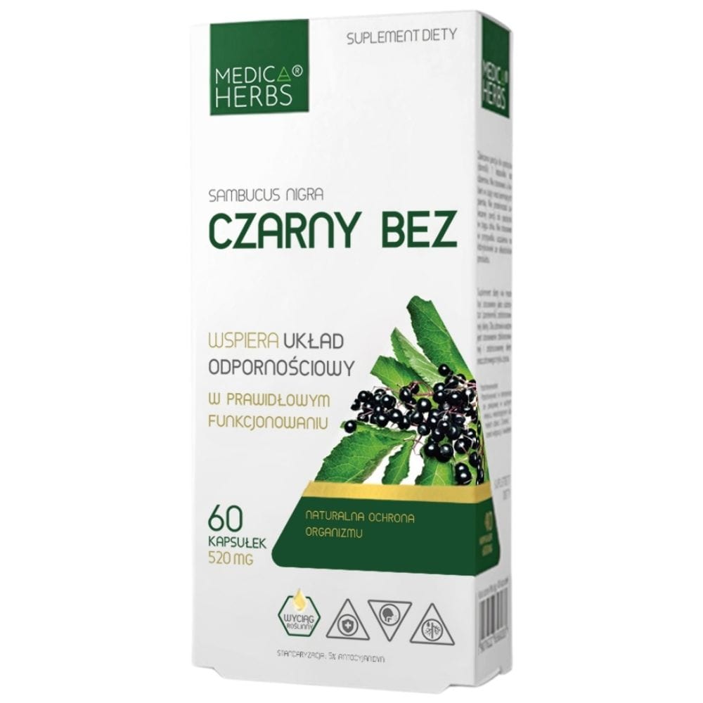 Medica Herbs Black Elderberry is a dietary supplement in capsules. Source of Sambucus nigra fruit extract, standardised to contain 5% anthocyanidins. It provides 520 mg of extract, including 26 mg of anthocyanidins.