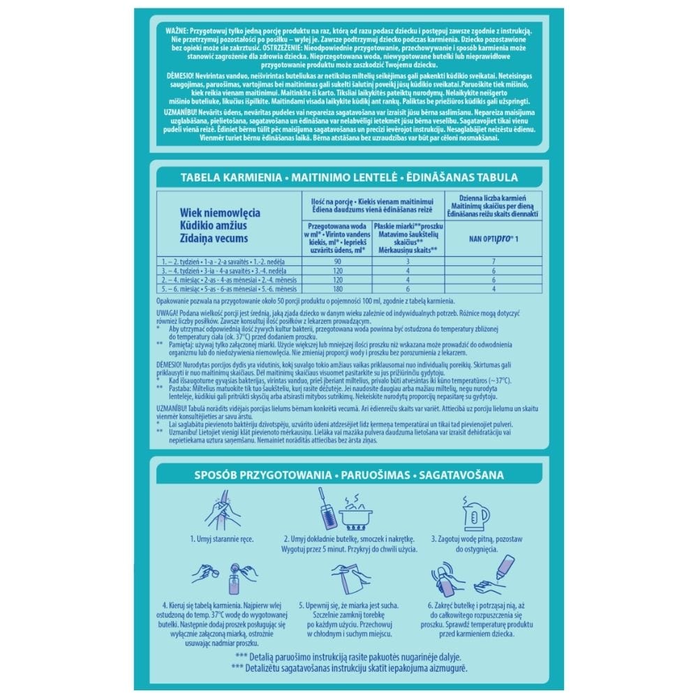 Prepare only one portion of milk at a time, which you will feed to your baby immediately, and always follow the instructions. Do not keep leftovers after a meal – pour them away. Always support your baby during feeding. A baby left unattended may choke.