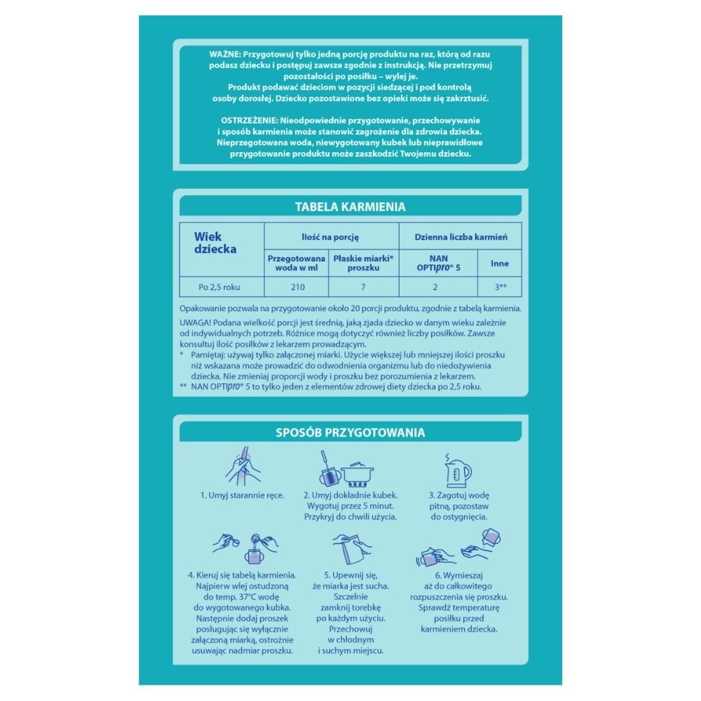 Prepare only one portion of milk at a time, which you will feed to your child immediately, and always follow the instructions. Do not keep leftovers after a meal – pour them away. Always support your child while feeding. A child left unattended may choke.