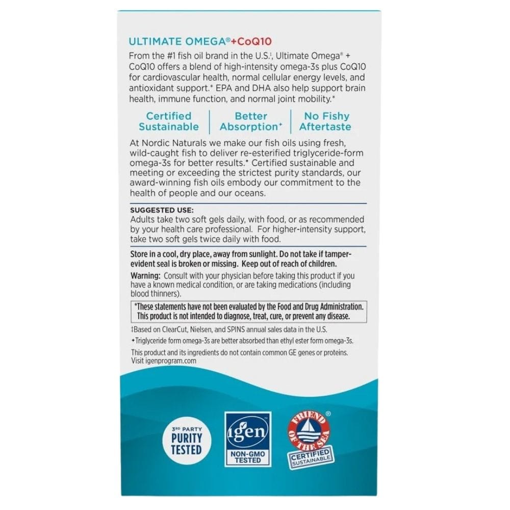 Nordic Naturals Ultimate Omega + Coq10 is a dietary supplement in gel capsules. It contains highly concentrated omega-3 fatty acids with added coenzyme Q10.