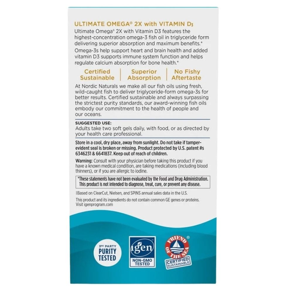 Ultimate Omega 2X with vitamin D3 contains as much as 2000 mg of EPA + DHA and 1000 IU of vitamin D3 per serving.