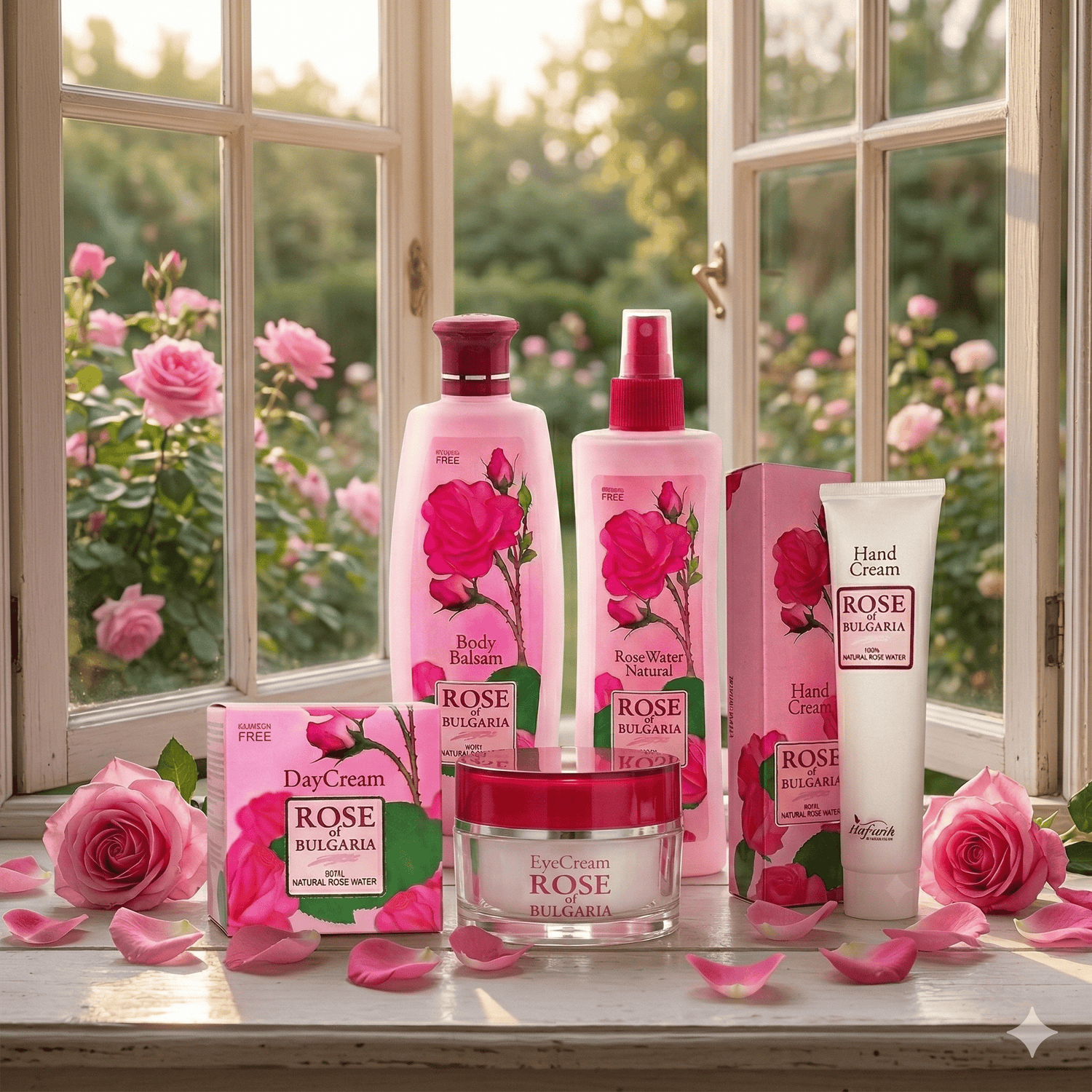 - Rose of Bulgaria Natural Rose Water – 230 ml – a pure, steam-distilled floral water made from hand-picked Damask roses. Used as a toner, facial mist or makeup setting spray, it instantly refreshes, tightens pores and soothes redness.
