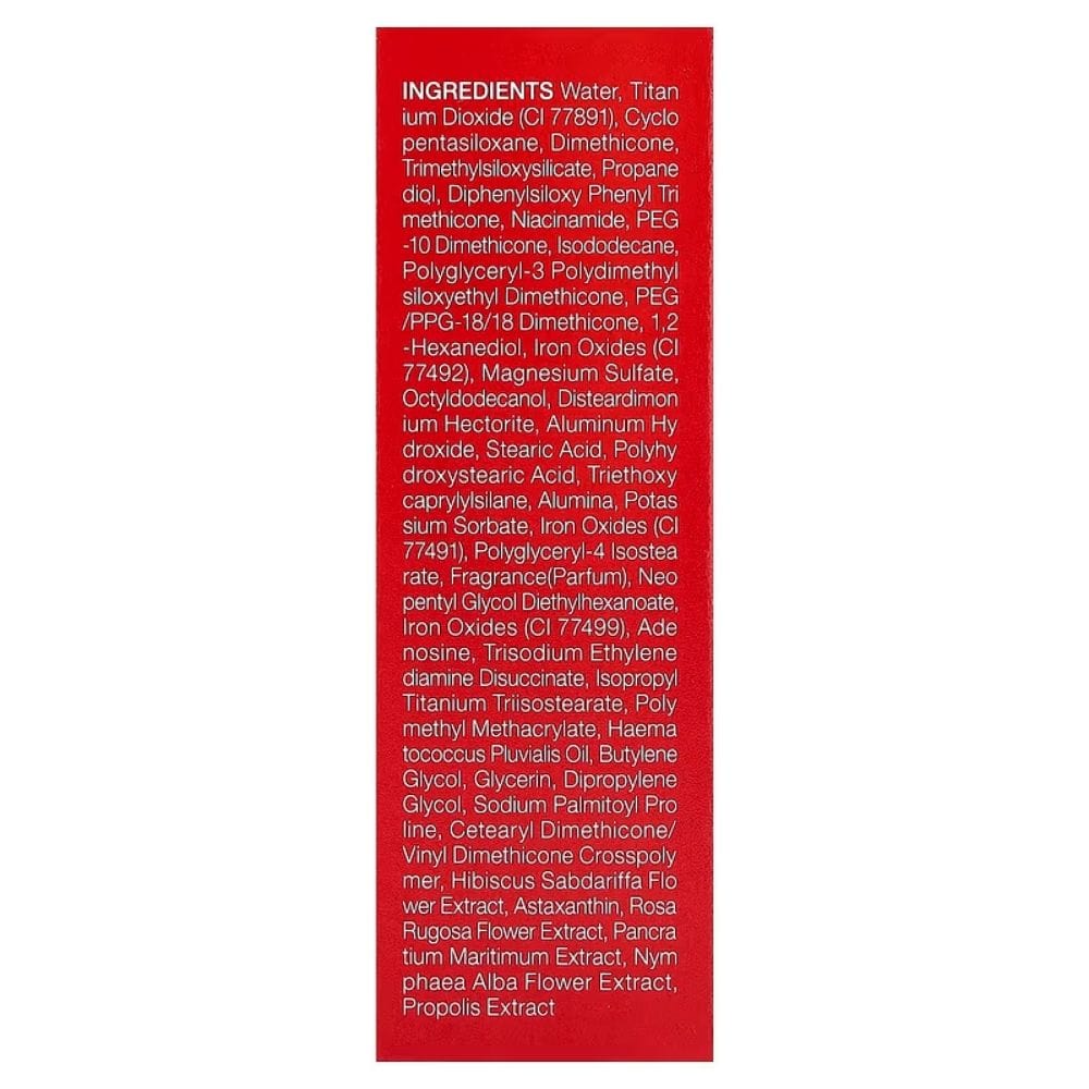 Water, titanium dioxide (ci 77891), cyclopentasiloxane, dimethicone, trimethylsiloxysilicate, propane diol, diphenylsiloxy phenyl tri methicone, niacinamide, peg -10 dimethicone, isododecane, polyglyceryl-3 polydimethylsiloxyethyl dimethicone, peg /ppg-18/18 dimethicone, 1,2 -hexanediol, iron oxides (ci 77492), magnesium sulfate, octyldodecanol, disteardimonium hectorite, aluminum hydroxide, stearic acid, polyhydroxystearic acid, triethoxycaprylylsilane, alumina, potas sium sorbate, iron oxides (ci 77491), polyglyceryl-4 isostearate, fragrance(parfum), neo pentyl glycol diethylhexanoate, iron oxides (ci 77499), adenosine, trisodium ethylene diamine disuccinate, isopropyl titanium triisostearate, poly methyl methacrylate, haematococcus pluvialis oil, butylene glycol, glycerin, dipropylene glycol, sodium palmitoyl pro line, cetearyl dimethicone/ vinyl dimethicone crosspolymer, hibiscus sabdariffa flo wer extract, astaxanthin, rosa rugosa flower extract, pancra tium maritimum extract, nymphaea alba flower extract, propolis extract.