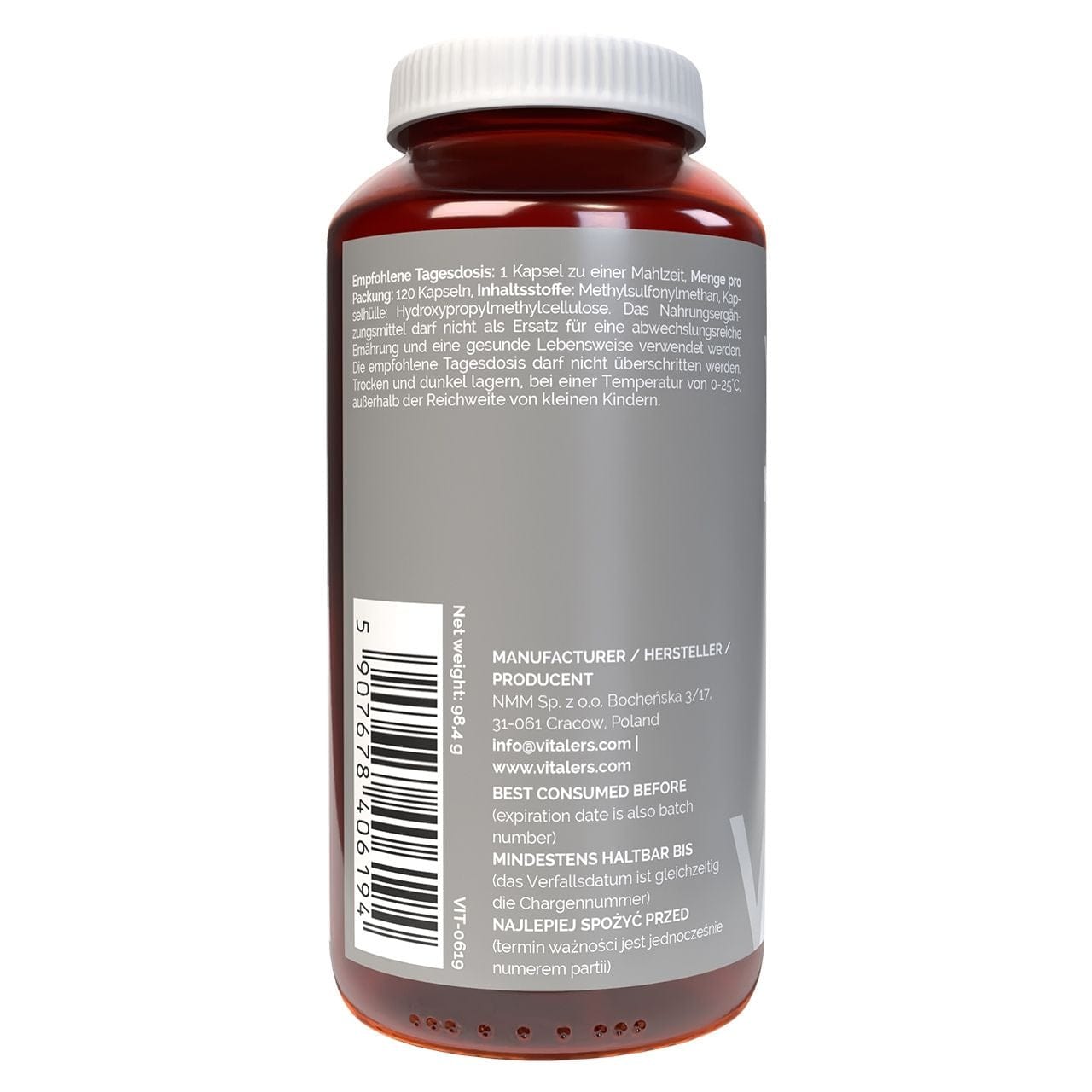 Vitaler's MSM (Organic Sulphur) 700 mg is a dietary supplement in capsule form containing 700 mg of methylsulfonylmethane (MSM) in each capsule. MSM is an organic sulphur compound found naturally in certain fruits and vegetables, among other foods. HPMC capsules suitable for vegetarians and vegans. 120 capsules per pack. Does not contain: preservatives, flavourings, colourings, added sugar.
