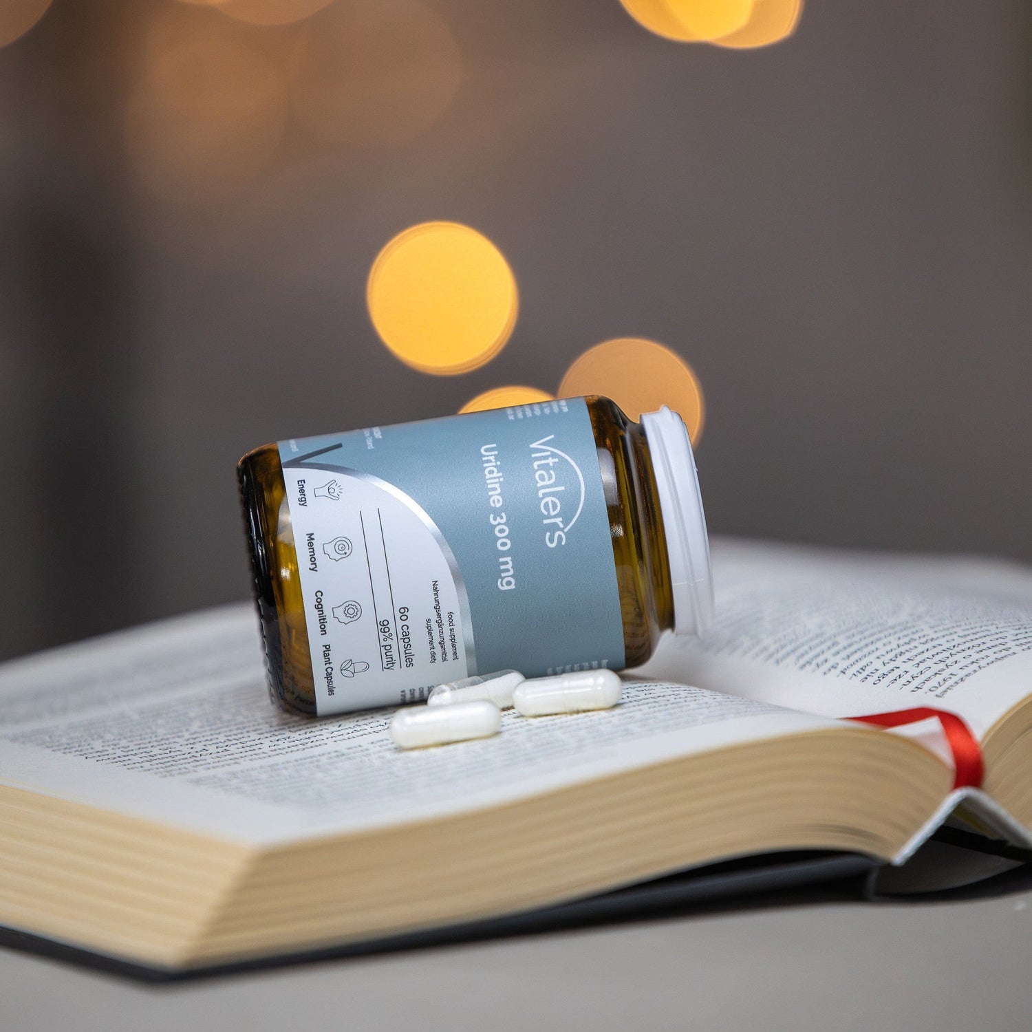 Uridine is a dietary supplement in capsule form from Vitaler's, containing 300 mg of uridine monophosphate (UMP). Uridine is a nucleotide that occurs naturally in fish, broccoli and parsley, among other foods. HPMC capsules suitable for vegans. Does not contain: preservatives, colourings, flavourings, added sugar.