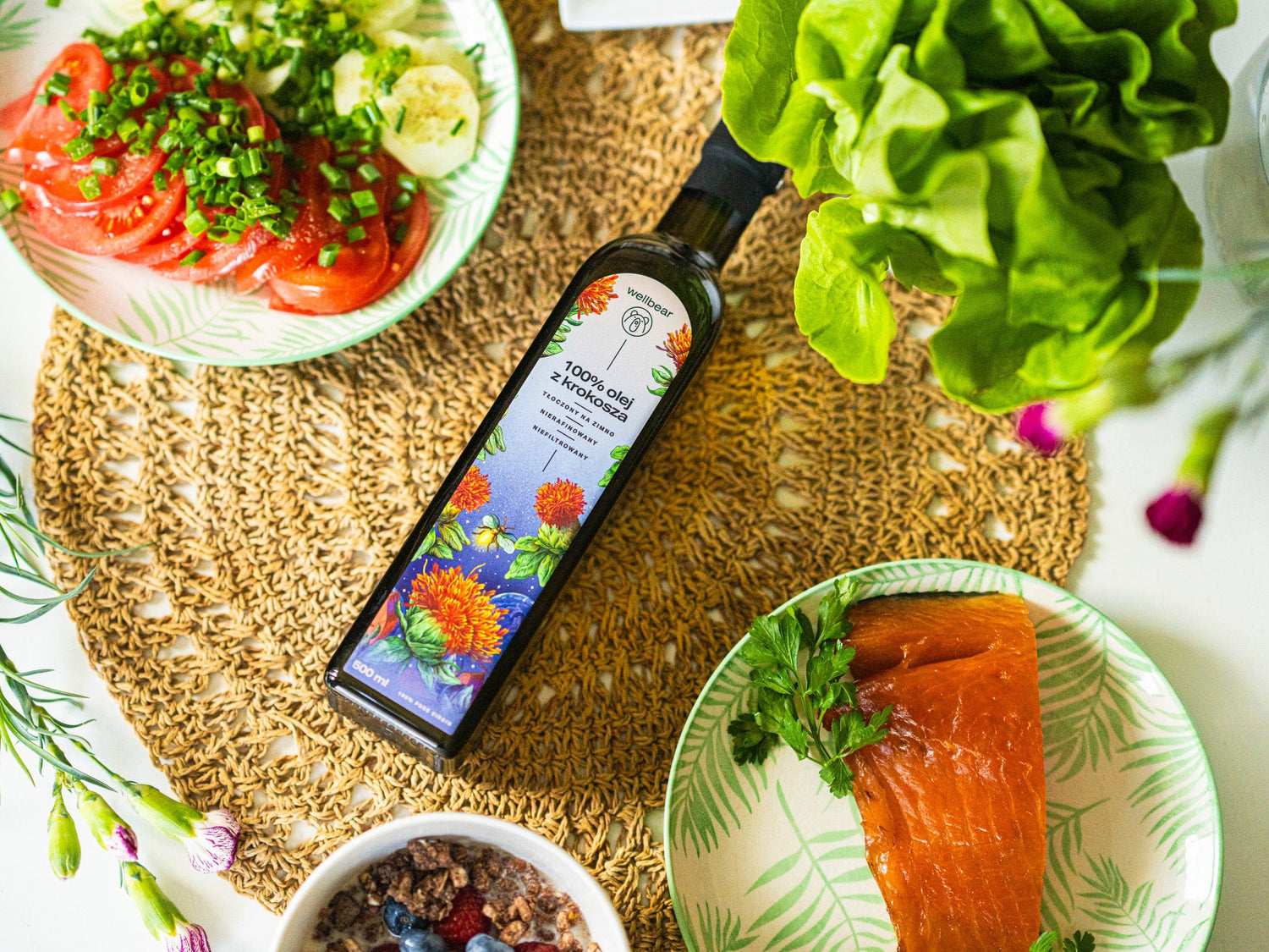 Safflower oil is widely used in the kitchen, making it easy to incorporate into your daily diet. The product has a light texture and a pleasant, slightly bitter taste. It is perfect for preparing salads, salads, dips and sauces. It is especially recommended as a base for homemade mayonnaise. However, it is worth remembering that safflower oil is not suitable for frying.