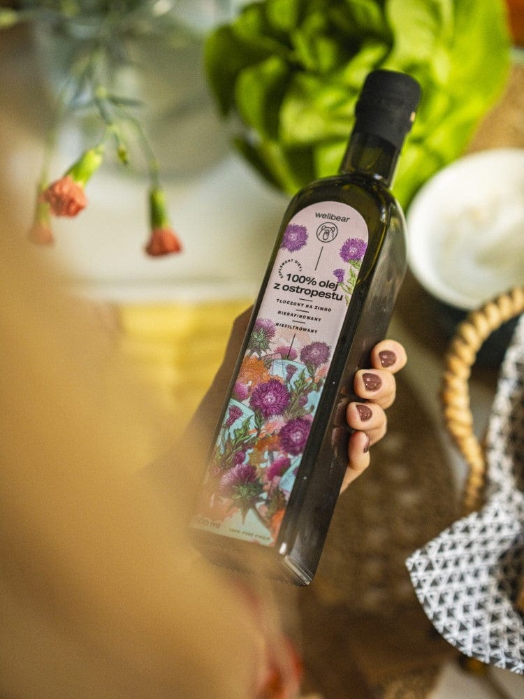 Milk thistle oil from Wellbear will help you keep your health in top condition. The oil is natural, unfiltered and unrefined, cold-pressed in a Polish oil mill. It has no preservatives or additives, so it retains its health-promoting properties for up to a month after opening the bottle when you keep it in the fridge.